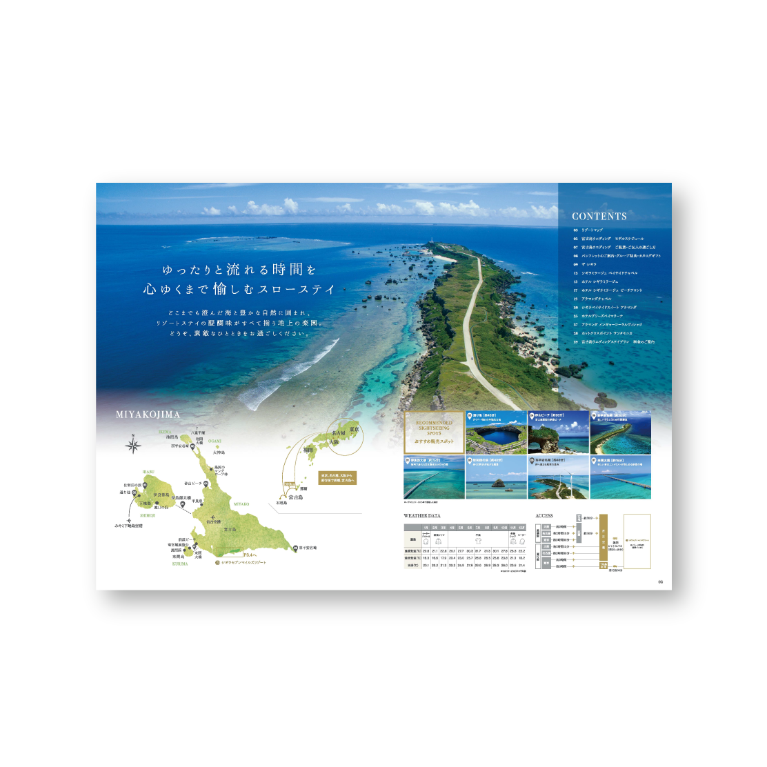 本パンフレットでは、宮古島ならではの美しい海やリゾートの雰囲気を伝えるために写真を多用し、