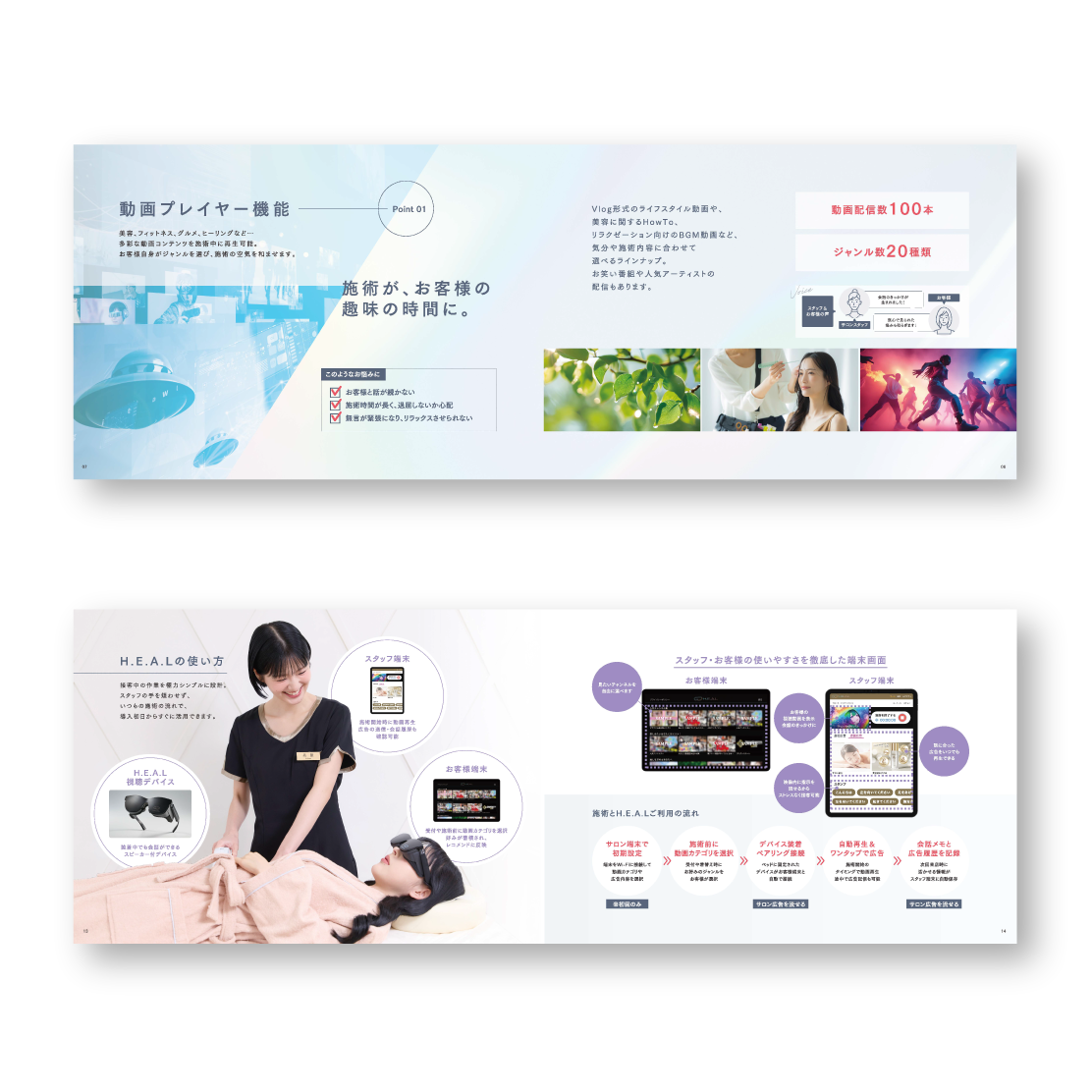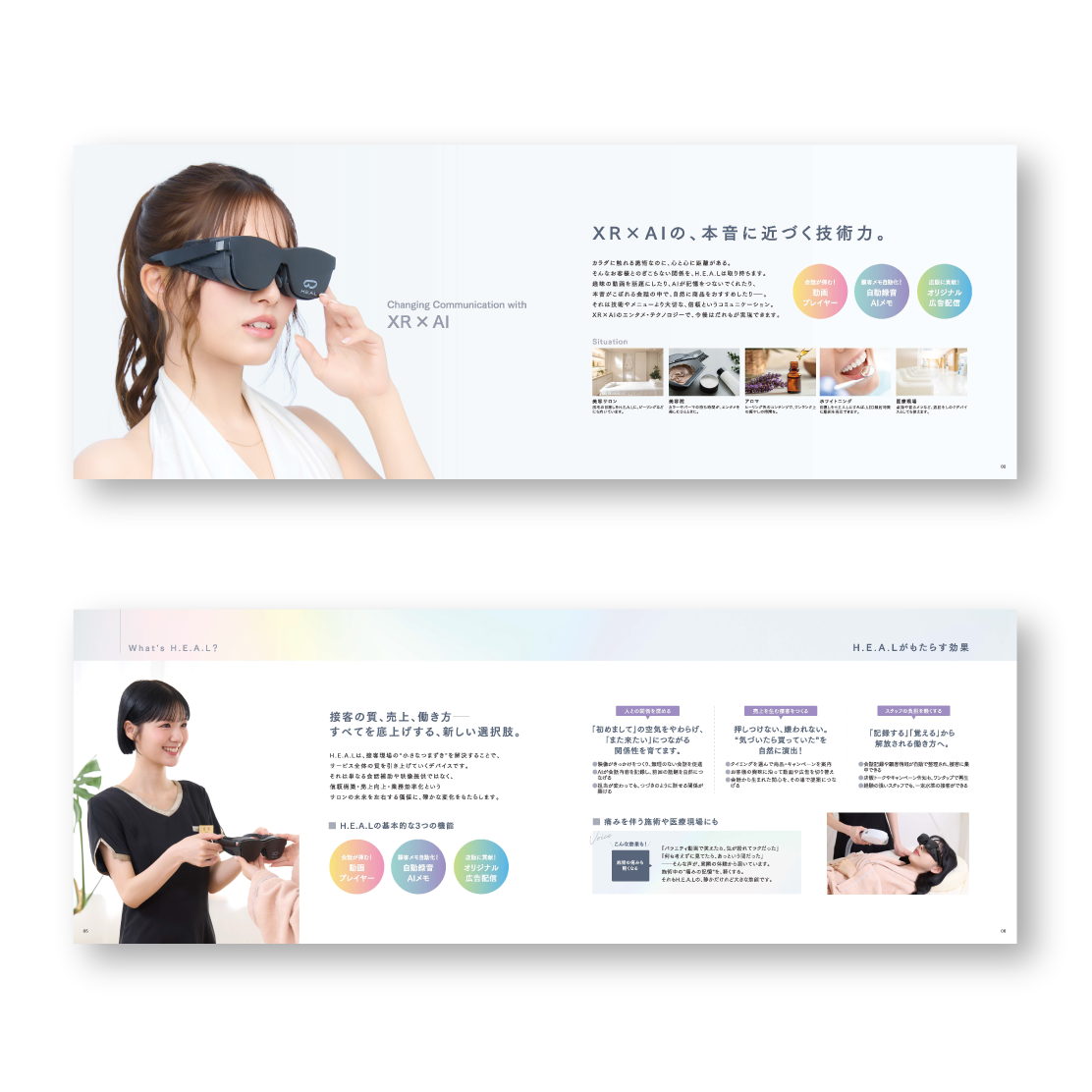 今回は、美容・脱毛サロン向けに開発された、多機能XR × AIアイウェア 「H.E.A.L」 のサロン様向け営業用パンフレットをデザインしました。